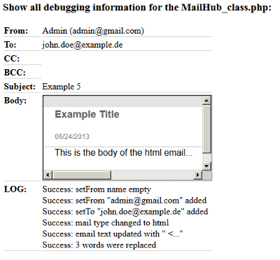 $mh = new MailHub();$mh->setSubject("Example 5");$mh->setFrom("admin@gmail.com", "Admin");$mh->setTo("john.doe@example.de");$mh->setMailType("html");$mh->setBody(EXAMPLE_BODY_HTML);$mh->replacePlaceholders( array("SUBJECT" => "Example Title","CURRENT_DATE" => date("m/d/Y", time()),"MESSAGE" => "This is the body of the html email..."));$mh->debug();